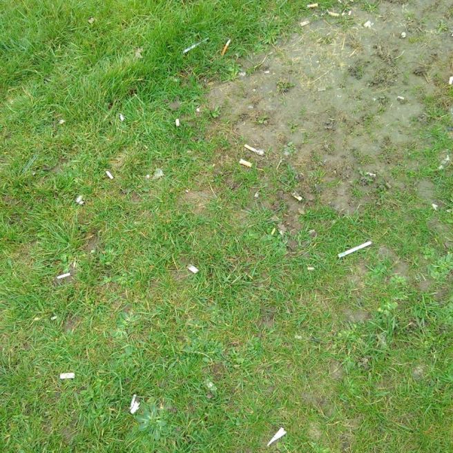 A patch of grass and bare earth strewn with a huge number of cigarette ends. Own photograph.